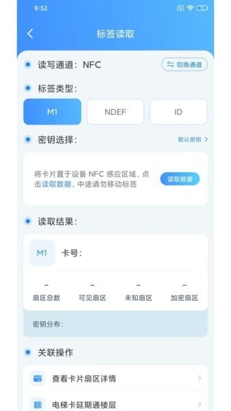 支持M1、NDEF、ID等类型读取;支持读写通道显示与切换;支持选择密钥后读取数据。