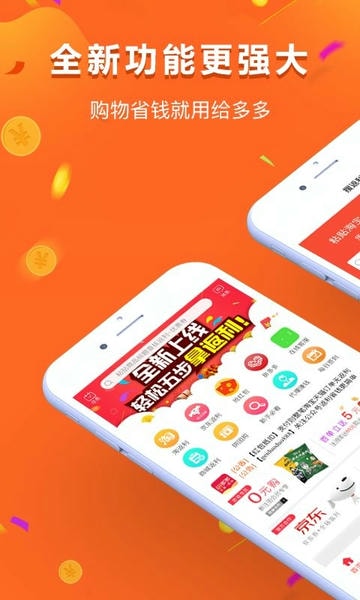 给多多全新升级,功能更加强大,能够为旗下用户提供免费优惠券,返利+优惠券让你购物更省钱,并且每天还有大额红包准时抢购,用来买心仪的物品是最棒的了,欢迎大家体验。