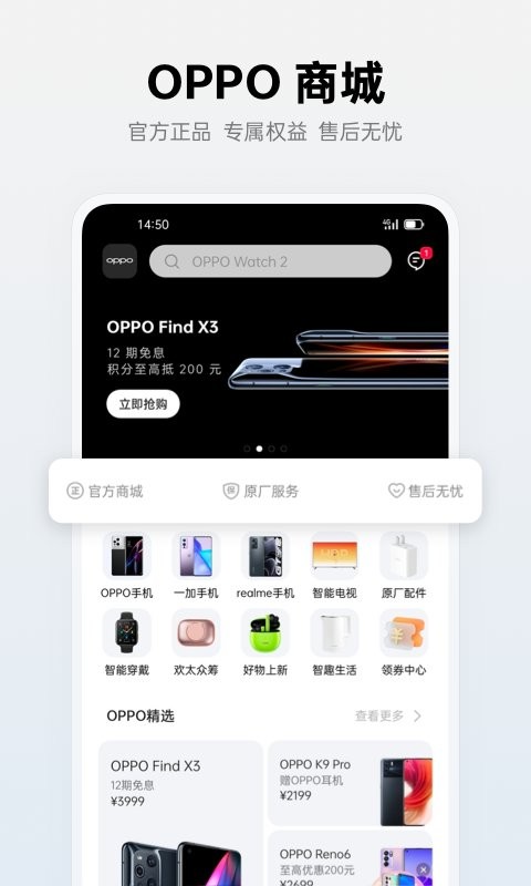 OPPO商城是一款由oppo官方推出的旗下手机以及配件官方自营app,用户通过oppo商城可以轻松购买正版oppo手机以及官方配件,海量活动尽享优惠,售后有保证,快来试试吧!