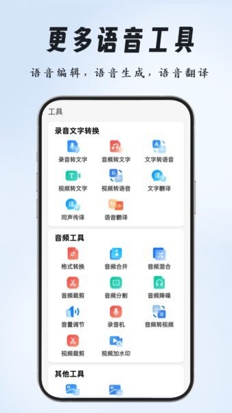 应用内置录音转文字功能,支持将音频内容快速转写成文字稿。这对于开会记录、课堂笔记、访谈等场景极为实用。图片中“录音文字转换”和“音频工具”按钮清晰可见,表明该功能使用流程简洁,适合频繁需要音频转写的用户,帮助他们节省大量整理时间。
