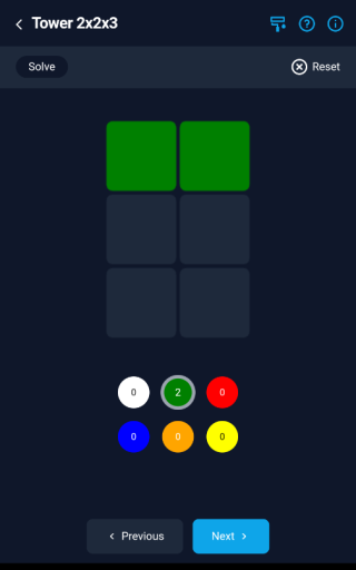 3、依据你手中魔方的图案颜色对各个面魔方的颜色情况进行描述上色,操作十分简易,点击Next,以同样的方式移动你真正的拼图,重复此操作,直到所有面都设置好。然后点击SOLVE,一步一步地获得3D解决方案。