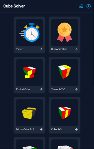 1、在本站下载安装好Cube Solver中文版,打开软件,来到主界面,【Timer】为魔方计时器,【Customization】为改变魔方样式,在下方可以选择你要获取还原方法的魔方类型。