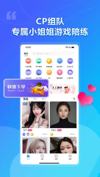 CPDD最新版是专为喜欢开黑的朋友们提供的语音交友聊天软件,不管我们玩什么游戏都可以在里面找到志同道合的朋友一起组队玩耍,享受合作的乐趣,还有超多萌妹帅哥陪你玩。