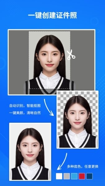 用户可根据需求选择蓝、白、红、渐变色等多种背景颜色,实时预览效果,保证符合护照、驾照、学生证等不同证件的具体规定。