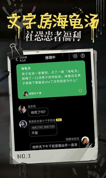 海龟汤情景推理聚会玩推理游戏,是一款通过海龟汤社交场景,提供给多人参与的、通过文字、语音等形式进行聊天交友交流的社交平台