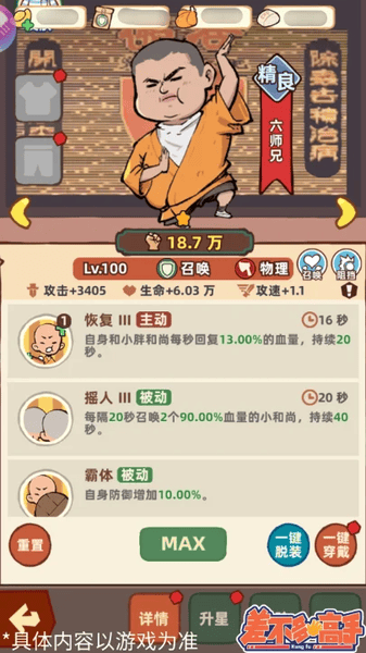 六师兄每隔一段时间,会召唤两个小和尚进入场中,来攻击和吸引敌人;六师兄的被动技能可以增加自己的防御,开启六师兄的主动技能,可以每秒钟给小和尚回复气血。六师兄是前期比较容易获得的召唤伙伴,在前期输出不足,敌人很容易到达老屋的时候,可以选择上阵六师兄试试哦~
