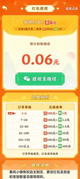 攻略6:活动与兑换理性参与:若你在活动页面看到“红包”“兑换”“微信提现”等入口,务必先阅读规则说明与门槛(例如订单等级、兑换倍率、提现记录等),按流程操作;不要为了追求进度盲目消耗资源,优先保障小镇长期产能与升级节奏。