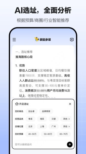 选址一直是餐饮创业的核心难题,袋鼠参谋利用美团自研AI模型,结合消费者画像、商圈竞争力和历史数据,为用户推荐最优门店位置。打开App,用户可直接进入“开店选址”模块查看详细分析报告及可行方案,极大提升选址效率与准确性。该功能在图片页面中以卡片及图表形式呈现,操作便捷,支持多维度筛选和比较,帮助餐饮老板科学布局未来发展蓝图。