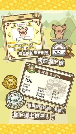 和全国的猪场主竞争!可以和全国的猪场主竞争。赚的最多的场主是谁?最多出货的场主是谁?养猪养得最好的场主又是谁?各种排行榜随时查看。你能否成为no.1呢?
