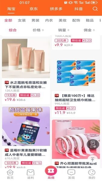 返赞移动客户端充分利用手机端的便捷优势,让用户随时随地发现优惠并参与返利。相比传统网页版,APP操作路径更简洁,首页底部导航清晰分布,将首页、商品、高佣、发现、我的等核心入口一目了然,为用户提供高效的导航体验。