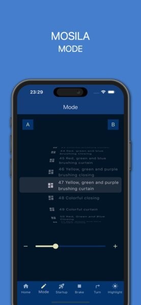 应用提供包括Startup、Brake、Turn等多种灯光模式,用户可以根据不同使用场景灵活切换。例如启动时的渐亮效果,制动时的高亮警示,以及转弯时的指示灯光,满足多样化需求,同时提升操作安全性和视觉效果的美观度。