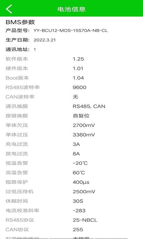 按应用场景的不同可以对电池类型、串数以及电压、电流的各项报警值进行修改;