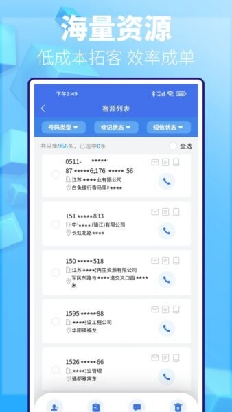 软件特别适合中小企业销售团队、渠道拓展人员以及独立销售顾问使用,在区域行业客户资源稀缺且竞争激烈的市场环境中,帮助用户快速聚合有价值的客源,实现低成本高效成单。通过开放的资源采集入口和短信套餐功能,用户能够灵活制定营销计划,并实时追踪订单进度,使客户管理更加科学化和系统化。
