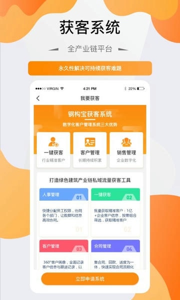 钢构宝app除了可以在上面购买钢构相关的材料,也可以寻找到工程信息,在你没有接到工地的时候可以使用它来进行获客,真的十分好用,来体验吧。