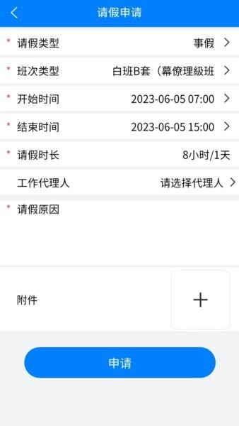 选择请假类型、班次类型、开始时间、结束时间;系统自动计算请假时长;可选择工作代理人;填写请假原因;支持上传附件;提交申请。