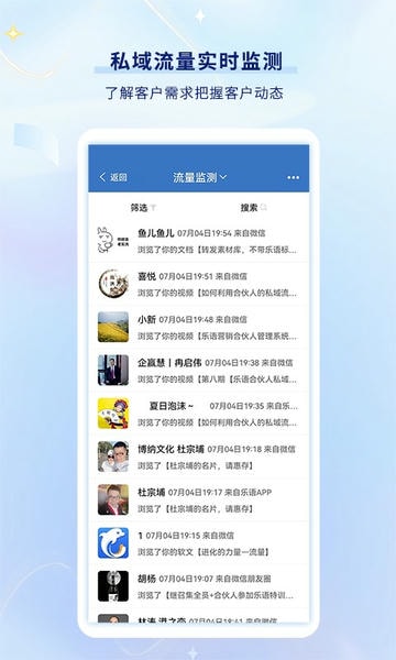 乐语app是专门为营销型企业提供服营运管理服务的办公类软件,这款手机应用不但兼具多种客户管理和维护的功能,还能实时监测私域流量,可帮助销售员快速了解和掌握相关客户的需求,从而更好地服务自己的客户资源。