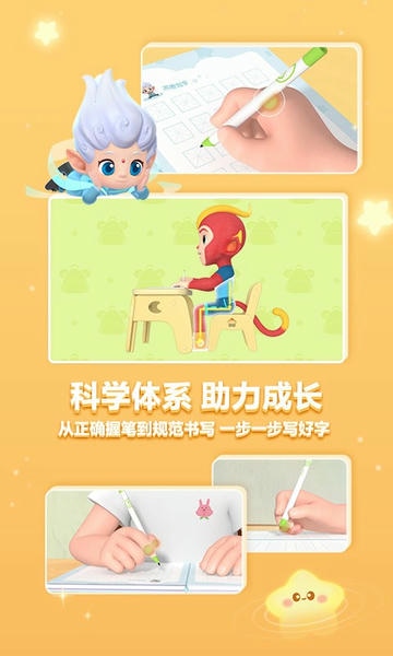 根据儿童的认知特点,全新设计的“笔贝贝”卡通形象串联整个奇幻写字之旅,沉浸式陪伴中启迪书写天赋、激发学习热情。《洪恩写字》打造了一套全新的奇幻汉字世界观,结合专业精美的视听画面和定制化的趣味交互设计,增强孩子的动手能力及思维创造力,提升鉴赏力和综合素养。