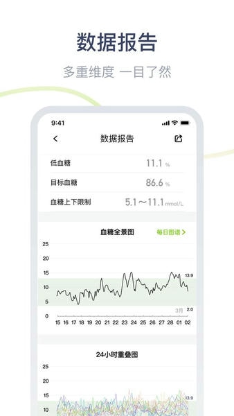 -数据报告功能可查看报告,如目标范围内的时间、血糖全景图、24小时重叠图、高低血糖区域图等,并可一键分享。