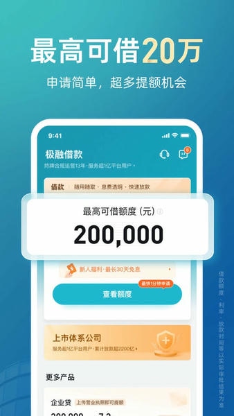 极融借款app是专为创业、打工或者是需要投资的朋友们提供的贷款软件,最高可以支持30天免息,并且利率低,放款快,基本7天内都可以到账,非常的快速,有需要的可以自行下载体验。
