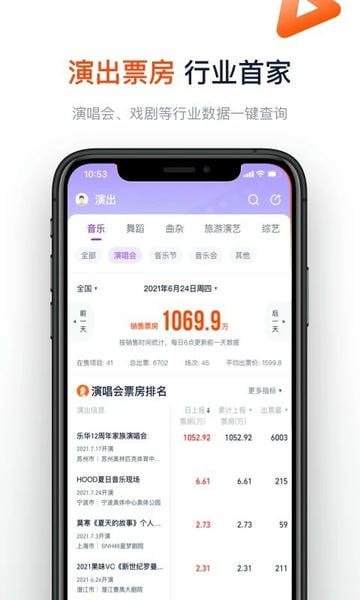 演出票房数据:首家公开演出行业票房,支持查看各演出类型票房数据、单项目售卖数据;