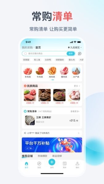 软件界面以简洁明快的蓝白配色为主,操作路径清晰,首页主要模块包括需求发布、在线比价、常购清单和我的采购等栏目,帮助用户从发布采购需求开始,到报价管理、商家匹配直至物流跟踪,每一步都井然有序。页面中常购清单和订单状态管理功能显著,满足了餐饮商家频繁采购和后续跟踪的需求,界面上的按钮和分类标签设计合理,方便用户快速定位所需内容。