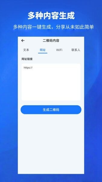 除了常见的文本、网址、WIFI和联系人,APP还支持多种自定义内容二维码生成,满足用户多元化需求,增加使用灵活性和创意空间。