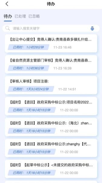 待办模块针对审批流程中的各类任务设立了“待办”、“已处理”、“已忽略”三大标签,实现任务状态的明确划分。用户可查看具体审批事项及耗时情况,如项目注册审核、政府采购中标公示处理等,有助于跟踪工作进展,优化时间管理,提升工作效率。这种任务管理方式类似于新能源汽车app中的订单跟踪功能,增强了用户对流程的掌控力。