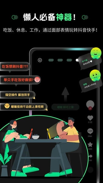 无论是吃饭时、上班课间的空闲时间,还是回家休息时,手机放远处,露张脸就可以轻松隔空刷抖音、快手、微信视频号等短视频,或者隔空翻页阅读小说。不仅如此,隔空操作APP支持所有手机应用程序,通过绑定表情,使您能够实现隔空操作。