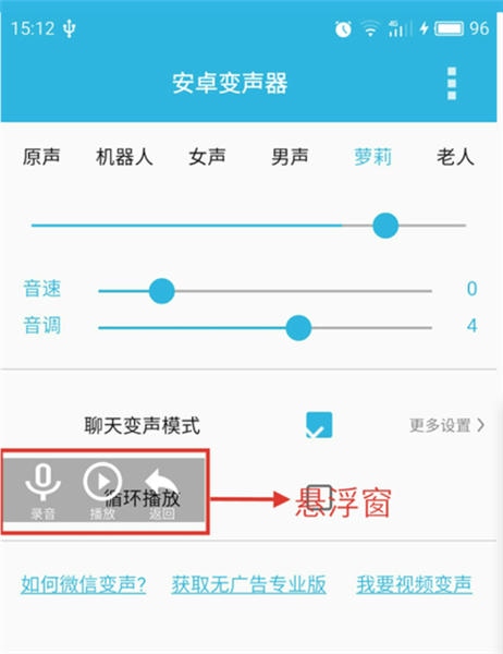 3、点悬浮窗播放,会先倒计时两秒再放变声后的声音,悬浮窗上倒计时为1时按住微信的录音键,直到变声语音播放完后再松开发送出去