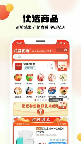 兴盛优选app专为社区居民提供便捷购物体验的购物工具。让你不用到菜市场,在手机上就能看到更多更全面的生鲜蔬果以及各种生活用品,还有超多折扣以及优惠,在你家门口的掌上购物商城!