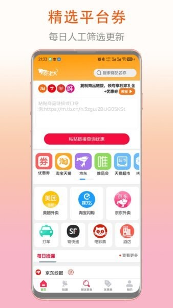 券老大官方app是一款主打领券再买更省钱的优惠券与生活权益聚合工具,围绕网购、外卖、出行、快递等高频消费场景,帮助你更快找到可用优惠。打开App即可浏览精选平台券与热门活动,也可以通过搜索商品、复制链接一键查询等方式定位同款优惠,减少到处翻找的时间。应用内还提供每日捡漏、整点抢购、优惠提醒等模块,让省钱更直观、更可操作。