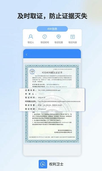 权利卫士拍照取证所产生的照片被自动进行可信时间戳固化,生成为不可否认和篡改的电子证据。
