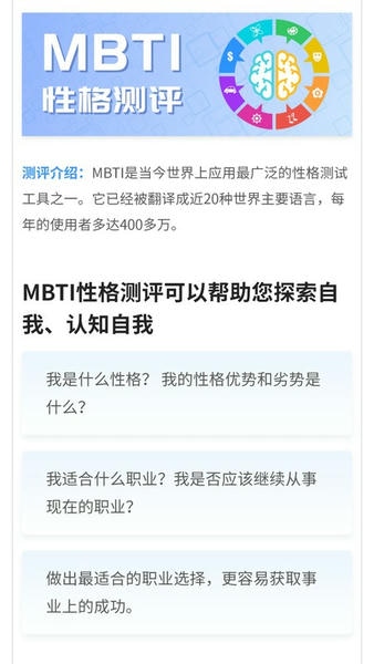 -资源丰富实用:除了测评服务外,平台还提供了一些与心理学、职业发展相关的文章和资讯,为用户提供了更多的学习和参考资源。