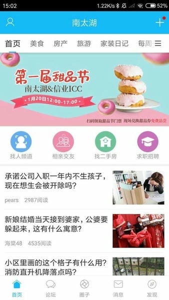 4.南太湖论坛通过传达最及时的地方信息、反映最生动的民生百态、表达最直接的情感诉求,已成为满足湖州网友文化、生活、休闲、消费等各方面需求的网上家园.