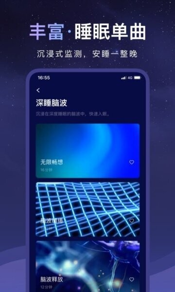 深睡脑波单曲全面覆盖不同时长和风格的助眠音乐,用户可根据需求选择“无限畅想”、“脑波缠绕”等单曲,提升入睡体验。