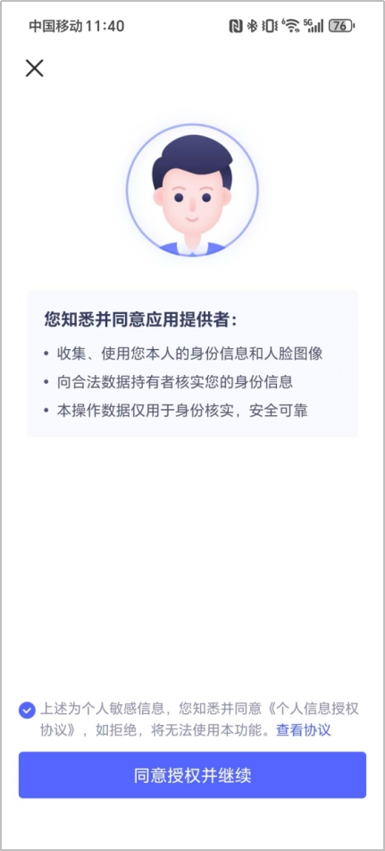 完成基本信息的填写后,进入人脸识别环节,系统会提醒使用手机摄像头权限,请点击“同意”,并按照要求,完成人脸识别认证,如下图所示: