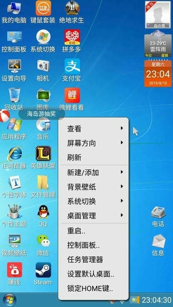 在桌面的长按菜单中集成了管理桌面图标、管理开始菜单、更换桌面背景、添加动态桌面、添加文件夹等功能。