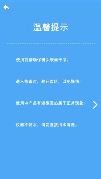 安全提示更贴心:提供“温馨提示”,包括检查前镜头清洁、避开危险区域、设备轻微发热属正常、设备不防水等提醒,降低误操作风险。