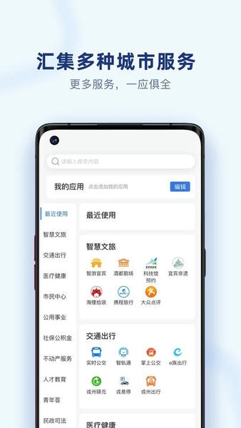 i宜宾是为宜宾市民打造的一站式城市移动综合服务平台,汇集政务服务、公共服务、社会治理、融媒体资讯于一体,实现公积金、医社保、不动产等政务服务,生活缴费、交通出行、预约办事等公共服务,婚姻登记、求职招聘、智慧校园等便民服务,同时上线“宜宾12345”应用,畅通政民互动渠道。“i宜宾”以大数据技术为依托,为宜宾市民提供个性、精准、智能化服务,让市民对宜宾智慧城市建设成果可感可及,持续提升宜宾社会治理水平和市民幸福感。