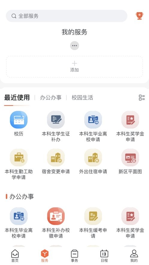 课程表、移动教务、空闲教室、奖惩助贷、就业招聘、社团等。