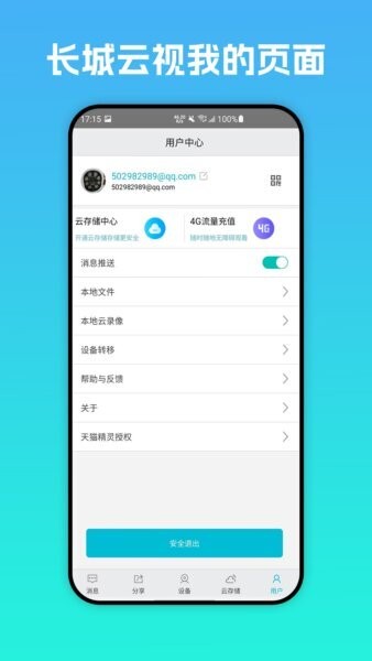 5. 用户中心功能齐全:提供云存储中心、4G流量充值、设备转移、帮助与反馈、关于等入口,账号与设备管理更完整。