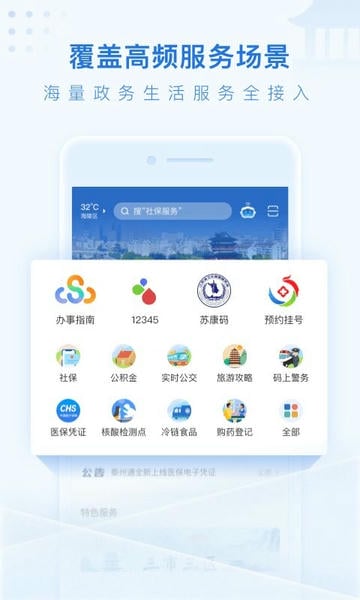 泰州通是一款专门为泰州市民设计的一款便民服务app,用户通过泰州通可以进行一系列全面的生活服务,可以查询社保,办理政务,医保社保查询,查健康码,医院预约等等服务,非常方便日常生活,快来试试吧!
