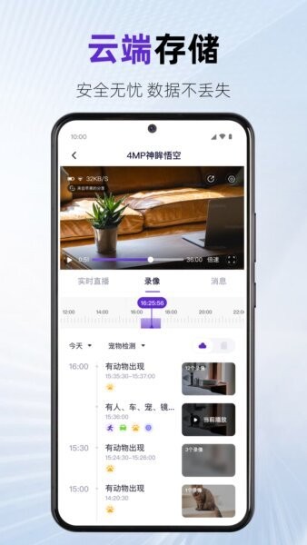 多场景智能标签:事件时间线中自动标注“有人出现”“宠物出现”等图标,让你不用逐条打开视频,就能快速分辨事件类型,查找更轻松。