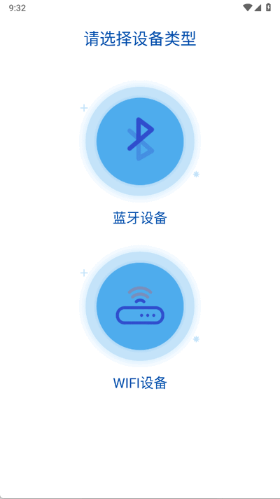 在「请选择设备类型」页,依据实际硬件选择「蓝牙设备」或「WiFi设备」。蓝牙设备需先确保开启手机蓝牙,WiFi 设备则请确认手机连接的是 2.4G 家庭网络。
