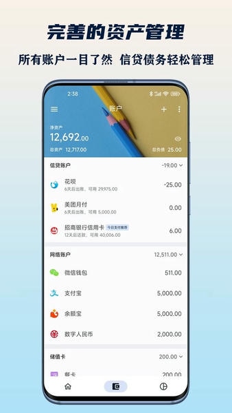 【账户】账户资产汇总管理,多种类型供您选择;账户排序、隐藏,由您定义;信用卡刷卡推荐、还款提醒,相当贴心;