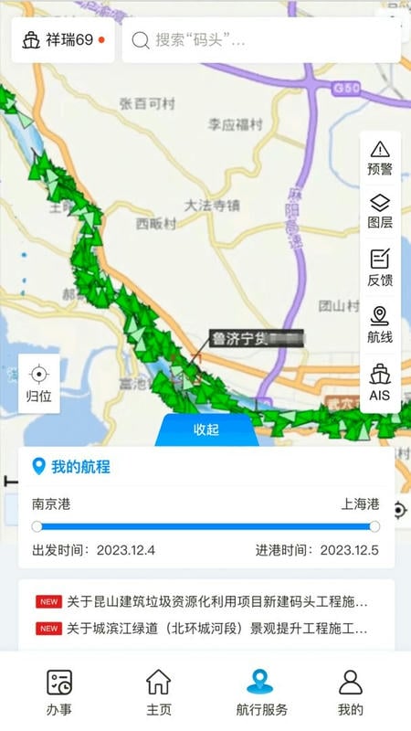 提供航线规划、预警信息查询、图层切换、问题反馈、我的航程等服务。可根据船舶实时船位和航行计划,智能推送水文气象、交通管制、锚地、水上服务区、船厂、泊位等信息。