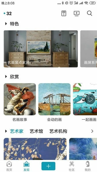 BOE画屏app是可以让艺术爱好者在线上看画展的服务类软件,当大家进入这款应用就会发现它的功能和抖音很像,我们在那里同样可以给自己喜欢的作品点赞或进行收藏。不过它还有专门的交流社区版块,用户是可以在其中自由交流的哦!