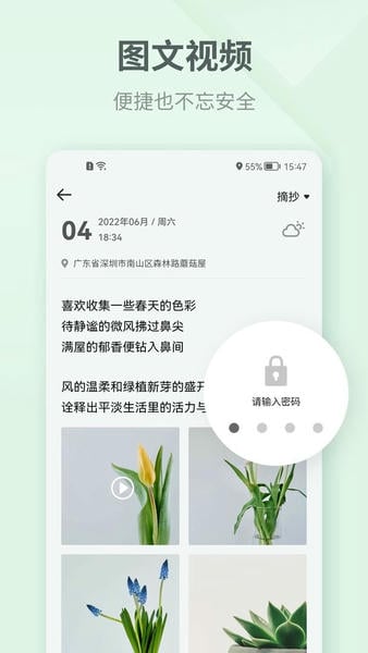 【密码】双密码+指纹锁,多重加密守护你的日记安全。