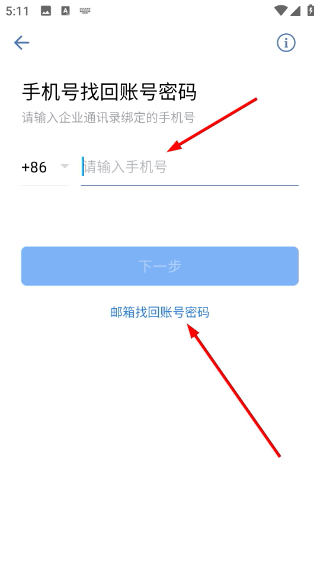 3、来到手机号找回账号密码页面输入绑定的手机号,还可点击邮箱找回账号密码切换找回方式。