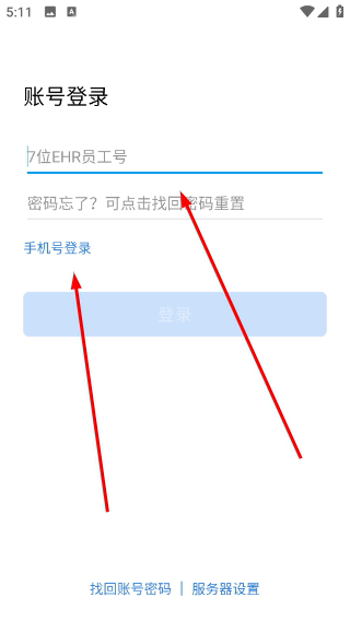 1、在账号登录界面可输入7位EHR员工号登录,也能点击手机号登录切换登录方式。